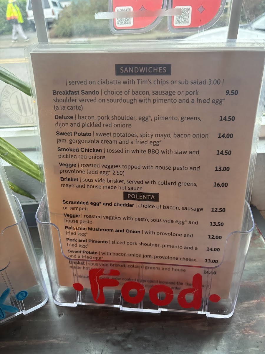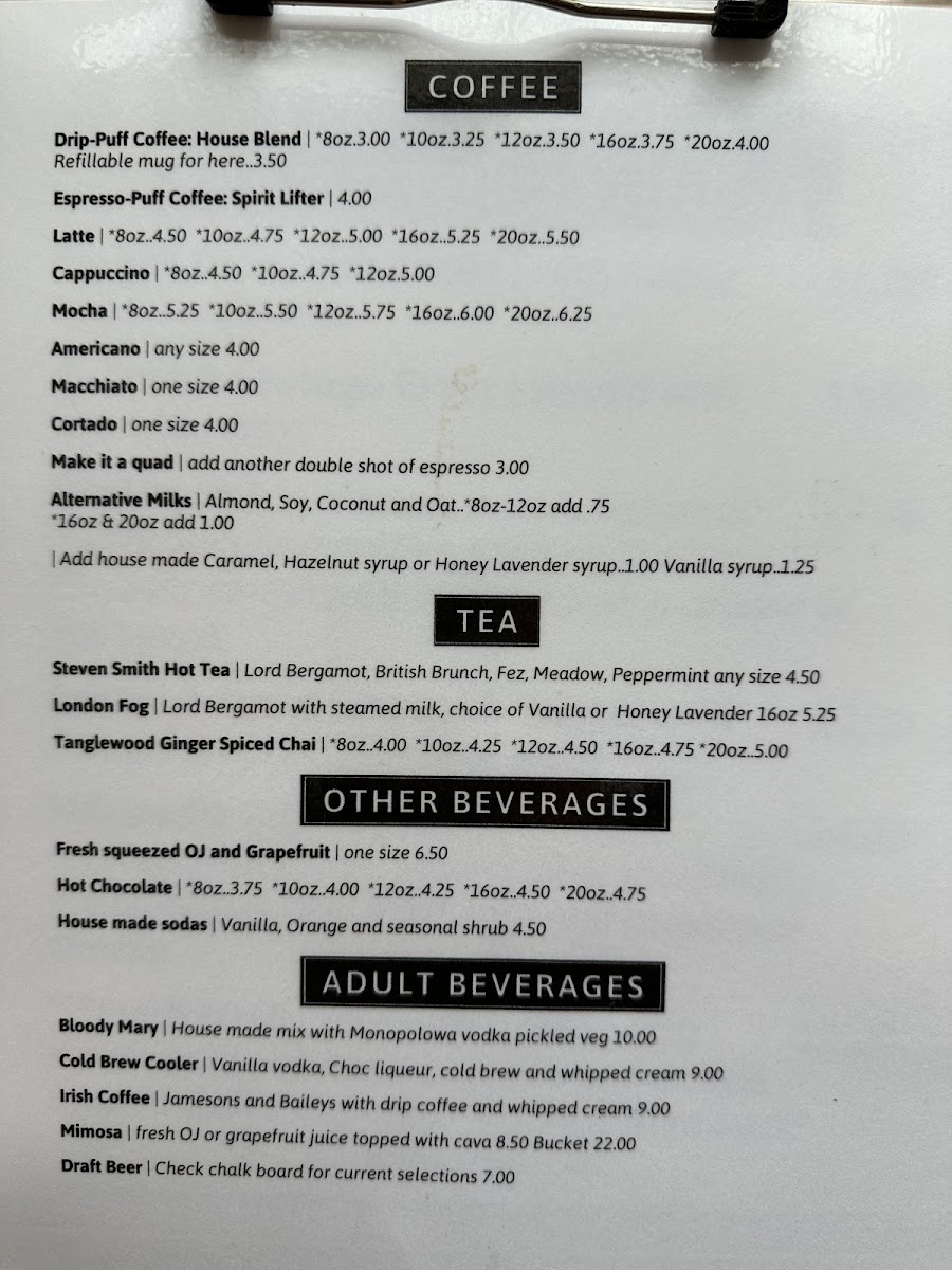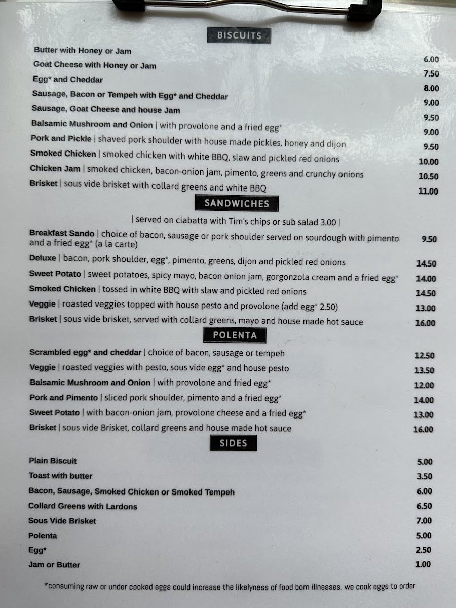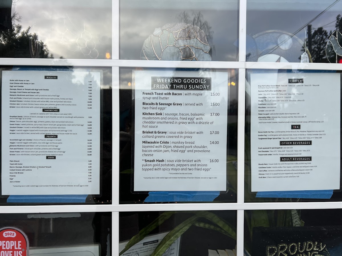 Breakfast items like biscuits smothered in gravy or French toast served with house-made bacon invite a slow, enjoyable start to the day, while savory polenta bowls and smoked meat sandwiches offer a filling midday option. The drink menu blends classic coffee selections with unique touches like a lavender-infused latte or seasonal sparkling sodas, perfect for pairing throughout the day.